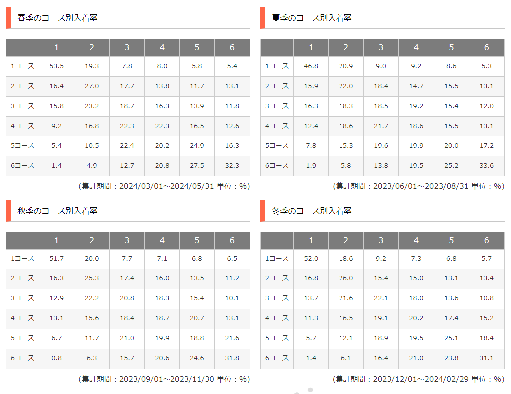 浜名湖競艇の特徴&コース別勝率・決まり手などの予想データ 目次 浜名湖競艇場とは? 施設概要 コースと水面の特徴 広大な水面 水質は汽水 風の影響 コース別勝率と決まり手 イン逃げが決まりにくい センターコースの有利性 大外からの攻め 予想のコツ まとめ あわせて読みたい 全国に24箇所存在する競艇場は、それぞれの立地により水面や水質、自然環境の影響が異なるため、予想する際には各競艇場の特徴を理解しておくことが重要です。今回は、特に広大な水面で知られる浜名湖競艇場(ボートレース浜名湖)の特徴について詳しく解説します。 浜名湖競艇場とは? この投稿をInstagramで見る ボートレース浜名湖【公式】(@boatrace_hamanako)がシェアした投稿 浜名湖競艇場は東日本で1番目に開設された競艇場で、JR「新居町駅」からすぐの場所にあり、公共交通機関でのアクセスも良好です。晴天時には富士山を眺めることができる立地が魅力です。 施設概要 住所:静岡県湖西市新居町中之郷3727-7 電話番号:053-594-7111 営業時間:10:00~17:00 所属:静岡支部 主な選手:徳増秀樹、坪井康晴、菊地孝平、長嶋万記 他多数 コースと水面の特徴 広大な水面 浜名湖競艇場は広い水面が特徴で、競走水面全体の幅は168.7mあります。また、形状はプール型と呼ばれる長方形で、第1ターンマーク後のバックストレッチ側の幅が126mと大きく取られています。 水質は汽水 浜名湖競艇場の水質は淡水と海水が混じった汽水で、塩分濃度が高いことから海水に近い特徴を持ちます。水面の安定性が高く、操縦がしやすい水面となっています。 風の影響 浜名湖競艇場は南北に向かって水面が伸びているため、季節ごとの風の影響を大きく受けます。特に南風や北風が強く吹くことが多く、これがレース展開に大きな影響を及ぼします。 コース別勝率と決まり手 イン逃げが決まりにくい 浜名湖競艇場では1コースの勝率が全国平均よりも低く、イン逃げの成功率が54%台後半です。これは、風の影響が大きく、向かい風や追い風によってインコースが不利になることが多いためです。 センターコースの有利性 3~4コースからの攻めが有効で、特に捲り差しが決まりやすい傾向があります。バックストレッチの広さがこれを助長しています。 大外からの攻め 5~6コースからの捲り差しも有効です。強い風の影響を受けると、内側の艇が流れやすくなるため、外からの攻めが決まりやすくなります。 予想のコツ 風情報の確認:レース展開を読むために風の強さと方向を必ずチェックしましょう。 モーターの性能を重視:モーターの2連率や展示タイムを参考に、良いモーターを見極めましょう。 スタート展示の進入隊形:浜名湖競艇場は進入隊形が乱れやすいため、スタート展示の進入を重視して予想を立てましょう。 まとめ 浜名湖競艇場は広大な水面と安定した水質が特徴でありながら、風の影響を強く受けるため予想が難しい面もあります。風情報やモーターの性能、スタート展示を重視し、イン逃げ以外の決まり手も視野に入れて予想を立てることがポイントです。 あわせて読みたい 無料でよく当たる!優良予想サイト紹介「ブルーラグーン」「ドレミボート」 Post Views: 2,064 最近観覧した記事 おすすめコンテンツ 【検証あり】無料でよく当たる!優良予想サイト紹介「ブルーラグーン」「ドレミボート」【口コミ・評判など】 7月 4, 2024 ギャンブル全般, ニュース 2024年版 美人ボートレーサー紹介! 6月 13, 2024 ボートレーサー, 競艇(ボートレース) マイケル田代引退の軌跡 ~艇界初のフィリピン国籍レーサーが歩んだ12年~ 1月 28, 2025 ボートレーサー, 競艇(ボートレース) ボートレースで起きた衝撃的な大事故を紹介!常に危険と隣り合わせ! 6月 11, 2024 競艇(ボートレース), 伝説のB1級「峰竜太」!歴史に刻まれた偉大な記録の数々 6月 6, 2024 ボートレーサー, 競艇(ボートレース) 競艇の違反と罰則を紹介~実際の映像など~ 9月 12, 2024 競艇(ボートレース), 競艇の基礎知識 人気の記事 2024年に引退および登録削除された競艇選手の一覧とその理由 2024年6月13日 競艇(ボートレース), 最年少デビューで注目された女子ボートレーサー、生田波美音が引退 2024年12月19日 ボートレーサー, 競艇(ボートレース) ボートレース(競艇)における「不良航法」と「妨害」について 2024年7月23日 競艇(ボートレース), 競艇の基礎知識 SGチャレンジカップとは?2024出場選手や出場条件、歴史など 2024年10月29日 競艇(ボートレース), ボートレーサー松田真実の紹介 2024年9月26日 ボートレーサー, 競艇(ボートレース) 薮内瑞希選手が内規違反で即刻帰郷 2024年7月9日 ニュース, 競艇(ボートレース) 新着記事 【検証あり】無料でよく当たる!優良予想サイト紹介「ブルーラグーン」「ドレミボート」【口コミ・評判など】 2024年7月4日 ギャンブル全般, ニュース 兄弟ボートレーサー・西丸敦基&西丸侑太朗 ~香川支部の若きホープ~ 2025年1月30日 ボートレーサー, 競艇(ボートレース) ルーキー西丸侑太朗がボートレース江戸川で嬉し