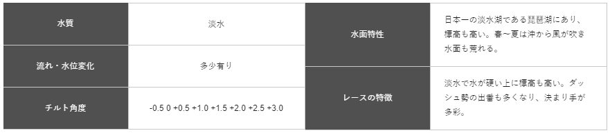 びわこ競艇場の特徴と攻略法 目次 びわこ競艇場の概要 コースレイアウトの特徴 水面特性と影響 風と波の影響 コース別勝率と決まり手 予想のポイント 水面特性を理解する 風向と風速の影響 モーターの性能と出足 地元選手の活躍 レース展開の読み センターコースの選手に注目 レース後のデータ分析 まとめ あわせて読みたい びわこ競艇場は、滋賀県大津市に位置するボートレース場です。琵琶湖の一部を競走水面として使用しており、日本一の淡水湖である琵琶湖を背景にした美しい景観が特徴です。しかし、その美しさとは裏腹に、競走水面の特性や天候条件がレース展開に大きく影響を与えるため、競艇ファンにとっては攻略が難しい場とされています。本記事では、びわこ競艇場の特徴やコース別勝率、決まり手などのデータを基に、予想のポイントを詳しく解説します。 びわこ競艇場の概要 びわこ競艇場は、1952年に開場しました。日本で二番目に設立された公認のボートレース場です。競走水面は琵琶湖の南端に位置しており、琵琶湖大橋や近江富士(三上山)を一望できる絶好のロケーションにあります。しかし、都市部からのアクセスが少々不便で、大阪や神戸などの都市部からは距離があります。そのため、来場者は主に滋賀県や京都府からの地元ファンが中心です。 コースレイアウトの特徴 びわこ競艇場のコースレイアウトは、2020年10月に35年ぶりに変更されました。第1ターンマークが沖合に3メートル移設され、ホーム側のスペースが広がりました。この変更により、1コースの艇が余裕を持ってターンできるようになり、インの窮屈さが解消されました。しかし、この変更はイン逃げの勝率を劇的に向上させるものではなく、むしろセンターコース(3コース)の攻めが有効になる結果となっています。 水面特性と影響 びわこ競艇場の水面特性は「淡水」であることが大きな特徴です。淡水は海水に比べて浮力が小さく、選手の体重が艇の動きに直接影響します。そのため、体重の軽い選手が有利となります。また、琵琶湖は標高85メートルに位置しており、これは全国的にも標高の高い競艇場です。標高が高いと気圧が低くなり、モーターの出力が弱くなります。特に出足の弱さに影響しやすく、これがイン逃げの難易度を上げる一因となっています。 風と波の影響 びわこ競艇場は、季節や天候によって風の影響が大きく変わります。春から夏にかけては沖からの風が吹きやすく、水面が荒れやすいです。特に春先には雪解け水の流入や観光船の航行による波が発生し、1マークが非常に乗りにくくなります。これに対して、秋から冬にかけては北西からの「比良おろし」という風が吹き、追い風になることが多いです。このような風の変化は、レース展開に大きな影響を与えます。 コース別勝率と決まり手 びわこ競艇場のコース別勝率は、以下の通りです: 1コース:51.4% 2コース:15.4% 3コース:12.8% 4コース:12.1% 5コース:7% 6コース:2% 1コースの勝率は全国平均とほぼ同じですが、イン逃げが決まりにくい傾向があります。特に向かい風が強い日は、2コースや3コースの選手が差しや捲りで上位に食い込むケースが増えます。また、3コースからの捲りと捲り差しが非常に有効であり、特にターンの技術に優れた選手が好成績を収める傾向があります。 びわこ競艇場での予想のポイントをさらに深掘りして解説します。以下に、びわこ競艇場特有の予想の要点を追加します。 予想のポイント 水面特性を理解する びわこ競艇場は淡水の競走水面であるため、海水面に比べて浮力が小さいのが特徴です。このため、艇の浮力が少なく、モーターの出力が低下する傾向があります。これがレース展開に与える影響は大きく、特にスタートから1マークへの加速が重要です。軽量級の選手が有利となるため、出走表をチェックし、体重の軽い選手を優先的に考慮することが重要です。 風向と風速の影響 びわこ競艇場は風の影響を受けやすい環境にあります。特に春先の風はレース展開に大きく影響を与える要因となります。 風向と風速の情報を確認することで、どのコースが有利かを見極めることができます。例えば、強い向かい風が吹いている場合、イン逃げが難しくなり、外枠からの差しや捲りが有利になります。一方、追い風の場合はスタートの加速が助けられるため、インコースからの逃げが決まりやすくなります。 モーターの性能と出足 標高が高いため、モーターの出足が弱くなる傾向があります。これにより、スタートの反応や1マークのターンが難しくなることがあります。モーターの性能はレース結果に大きく影響するため、スタート展示や直前情報でモーターの状態を確認することが大切です。特に、直線タイムやスタート展示での加速感を重視し、良いモーターを持つ選手を予想に組み入れると良いでしょう。 地元選手の活躍 びわこ競艇場の地元選手である滋賀支部の選手たちは、ホーム水面でのレース経験が