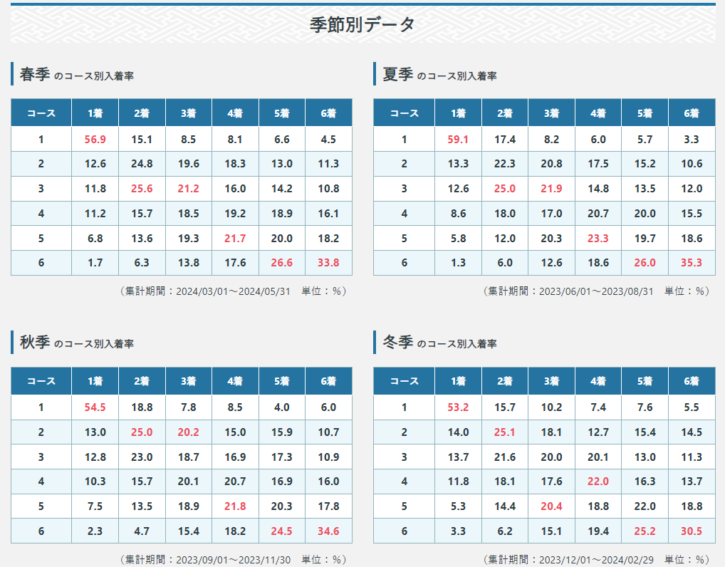 宮島競艇場の特徴&コース別勝率・決まり手などの予想データ 宮島競艇場(ボートレース宮島)は、広島県廿日市市にある競艇場です。この記事では、宮島競艇場の特徴やコース別勝率、決まり手などの予想データについて詳しく解説します。競艇歴の長さに関係なく、初心者から上級者まで参考になる情報を提供しますので、ぜひ最後までご覧ください。 競艇場の特徴 宮島競艇場は、広島湾の一角を利用して作られており、周囲の環境も含めて特有の条件があります。競艇場のスタンドは北側に位置し、南方には厳島神社を望むことができます。この位置関係を把握することが、宮島競艇場を攻略するための第一歩となります。 競走水面は海水であり、潮位の変化や風の影響がレースに大きく影響します。潮位差は最大で3メートルに達し、満潮時にはうねりが発生しやすくなります。このため、地元選手が有利とされることが多いです。また、宮島競艇場は200メートル標識が斜めに見えるため、ダッシュ艇のスタートが難しいとされています。 宮島競艇場の概要 名称: 宮島ボートレース場 住所: 広島県廿日市市宮島口一丁目15-60 公式HP: ボートレース宮島 電話番号: 0829-56-1122 営業時間: 9:00~17:00 宮島競艇場には、多くの著名な選手が所属しています。例えば、西島義則選手、市川哲也選手、辻栄蔵選手などが挙げられます。これらの選手は、宮島競艇場で多くの経験を積んでおり、地元選手として高い実力を誇っています。 宮島競艇場の水面の特徴 宮島競艇場の水面は海水であり、塩分濃度が高いため、淡水に比べて体重による影響が軽減されます。特に、体重が重い選手でもスピードを出しやすくなるため、体重差はあまり気にしなくてもよいでしょう。 宮島競艇場の最大の特徴は潮位差です。潮位が変化することで、うねりや潮の流れが生じます。満潮時には追潮となり、インコースが有利になります。一方、干潮時には向潮となり、ダッシュ勢が有利になります。このため、レース予想をする際には潮位や潮の流れを考慮することが重要です。 宮島競艇場のコースレイアウト 宮島競艇場のコースレイアウトには、1マークとスタンドの距離が短いことが挙げられます。この距離が短いと、1マークでの勝負が激しくなりやすく、差しコース(2, 4, 6コース)が不利になる傾向があります。また、スタートラインから1マークまでの振り幅が大きく、インコースと2コースに不利な設計がなされています。 宮島競艇場のコース別成績の特徴 宮島競艇場の直近のコース別成績を見てみると、2コースの3着率が最も高いことがわかります。これは珍しい傾向であり、1-2で固いレースが多い一方で、2コースが3着に差し残りやすいことを示しています。また、イン逃げ率は全国平均よりやや高めであり、3連対率も高いです。 コース別決まり手の傾向 宮島競艇場のコース別決まり手を見てみると、2コースの決まり手はほぼ差しであることがわかります。4コースの抜きや6コースのまくりが出やすい傾向もあります。このため、2コースの選手が差しを選択するかどうかが、レースの結果に大きく影響します。 風の影響 宮島競艇場では、潮位と風の影響を考慮することが重要です。風向きや風の強さによって、インコースやダッシュ勢が有利になるかどうかが変わります。特に、夏は向かい風、冬は追い風が多い傾向があります。 宮島競艇場のその他の特徴 宮島競艇場では、通年デイレースが開催されており、どの選手もデイレースに慣れています。また、モーターの交換時期は10月頃であり、交換直後のデータは参考にしにくいです。さらに、1日3レースの企画レースが行われており、特に9Rのティータイムは進入固定で予想しやすいです。 宮島競艇場のアクセス 宮島競艇場へのアクセスは、JR宮島口駅から徒歩3分、広電宮島ボートレース場駅から徒歩1分です。駐車場もありますが、SG・G1競走時には電車でのアクセスがおすすめです。 宮島競艇場のグルメ 宮島競艇場内のグルメとしては、4階の勝海舟で提供されるピリ辛モツ煮が人気です。その他、うどんやラーメンなども楽しめます。 宮島競艇場のライブやリプレイ 宮島競艇場のレース映像は、ボートキャストを利用してライブ中継やリプレイを楽しむことができます。スマホやパソコンで簡単にアクセスでき、無料で利用できるので便利です。 宮島競艇場で勝つために必要なこと 1. 潮位と風の影響を理解する 宮島競艇場は海水を利用した競艇場であり、潮位や風の影響がレースに大きく左右します。特に潮位差は最大で3メートルに達し、満潮と干潮では水面状況が大きく異なります。 満潮時: 追潮となり、インコースが有利になります。 干潮時: 向潮となり、ダッシュ勢が有利になります。 また、宮島競艇場は夏は向かい風、冬は追い風が多い傾向があります。風向きや風の強さによっても、インコースやダッシュ勢の有利不利が変わります。 予想のコツ 潮位表を確認し、満潮・干潮の時間