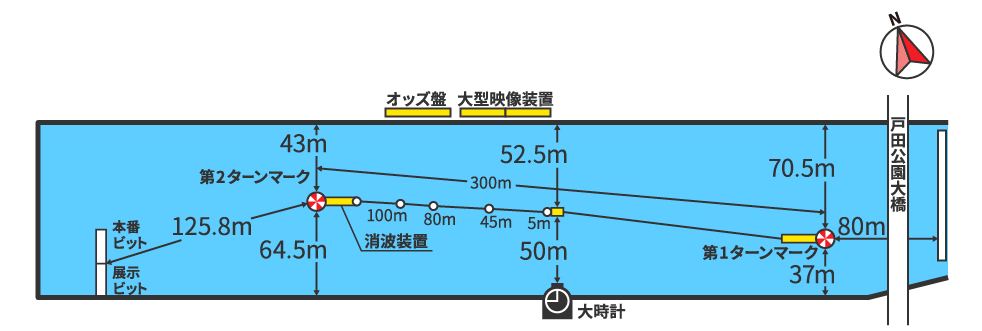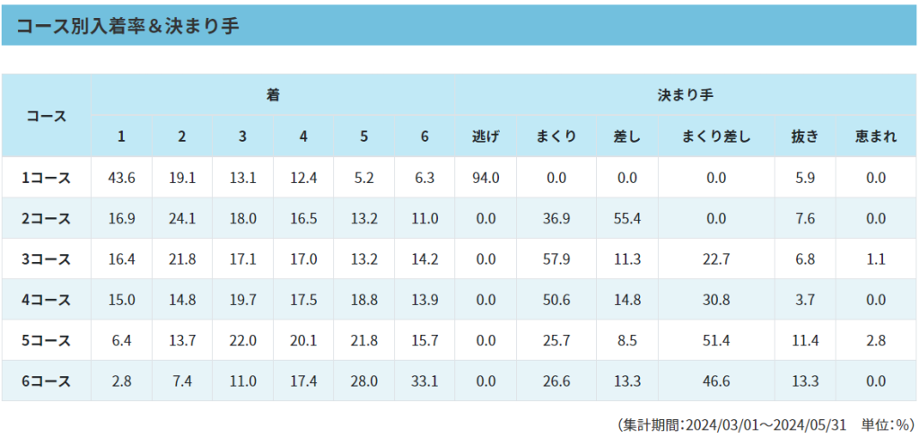 戸田競艇場の特徴と攻略法 目次 戸田競艇場の概要 戸田競艇場のコースと水質の特徴 狭い水面とターンマークの配置 水質 季節ごとの風向き 戸田競艇場の出目とデータの傾向 コース別1着率 決まり手の傾向 枠なり進入率 戸田競艇場の予想のコツ 3~6コースの1着を重視 スタートの良し悪しに注目 行き足とまわり足を重視 中穴と大穴狙い 戸田競艇場のアクセスと施設 アクセス 施設 子供の遊び場 ライブ中継とリプレイ まとめ あわせて読みたい 戸田競艇場の概要 この投稿をInstagramで見る 【公式】ボートレース戸田(@boatrace_toda)がシェアした投稿 戸田競艇場(ボートレース戸田)は、埼玉県戸田市に位置し、日本一狭い競走水面を持つ競艇場として知られています。競艇ファンの間では、その独特なコースと水質から、「難水面」とも称されます。 戸田競艇場のコースと水質の特徴 狭い水面とターンマークの配置 戸田競艇場の最大の特徴は、その狭さです。競走水面の横幅は全国で最も狭く、特に1マークがホーム側に近い配置となっています。具体的には、競走水面の横幅が107.5メートルしかなく、これは他の競艇場に比べて非常に狭いです。狭いコースゆえに、全速旋回が難しく、選手たちは細心の注意を払ってターンを行わなければなりません。 水質 水質は淡水で非常に硬く、艇が跳ねやすいという特徴があります。淡水は浮力が小さく、体重の重い選手にとってはスピードが出にくい環境となります。このため、選手の体重が予想に大きな影響を与えることになります。 季節ごとの風向き 季節によって風向きが変わることも、予想の難しさを増しています。春は向かい風、夏は右横風、秋は再び向かい風、冬は左横風が吹きやすいとされています。風速や風向きはレースに大きな影響を与えるため、直前情報で確認が必要です。 戸田競艇場の出目とデータの傾向 コース別1着率 戸田競艇場の1コース1着率は43.8%で、全国平均の55.5%と比較してかなり低いです。逆に、3~6コースの1着率は全国平均よりも高く、特に3・4コースが狙い目です。以下に、コース別の1着率を示します。 コース1着率偏差値1コース43.8%28.42コース14.9%54.33コース16.3%72.14コース15.2%80.25コース7.2%64.86コース2.6%64.7 決まり手の傾向 戸田競艇場では、差しやまくり差しが決まりにくく、まくりが決まりやすい傾向があります。特に、2~5コースのまくりが多く、スタートで先行する選手が有利です。 コース逃げ差しまくりまくり差し抜き1コース93.4%0.0%0.0%0.0%6.3%2コース0.0%53.5%36.3%0.0%9.3%3コース0.0%8.3%54.9%26.0%9.3%4コース0.0%17.6%52.9%21.7%6.7%5コース0.0%4.5%32.0%51.0%10.9%6コース0.0%17.5%33.2%34.4%12.6% 枠なり進入率 枠なり進入率は全国平均とほぼ同じですが、4~6号艇は前づけすることがあり、進入隊形が変わる可能性があります。 戸田競艇場の予想のコツ 3~6コースの1着を重視 戸田競艇場では、1コースの1着率が低いため、3~6コースの1着を狙うことが重要です。特に、3・4コースが有利です。3コース1着率は偏差値72.1、4コース1着率は偏差値80.2で、平均よりもかなり高いです。 スタートの良し悪しに注目 狭い水面のため、スタートの良し悪しが勝負を決めることが多いです。選手の平均スタートタイミング(ST)と今節のSTを比較して、スタートで先行できそうな選手を重視しましょう。 行き足とまわり足を重視 モーターの行き足とまわり足が重要です。行き足が良ければスタートで有利になり、まわり足が良ければターンでの安定性が増します。オリジナル展示データの直線タイムとまわり足タイムを確認し、評価しましょう。 中穴と大穴狙い 戸田競艇場では、三連単の中穴と大穴が出やすい傾向があります。三連単を買うときはオッズ20倍以上を狙い、期待値を重視しましょう。 戸田競艇場のアクセスと施設 アクセス 戸田競艇場は、JR東日本の戸田公園駅から無料送迎バスで約5分、車なら戸田東・西インターから約5分の距離にあります。無料駐車場も完備されており、約1,600台が駐車可能です。 施設 戸田競艇場には、有料席や指定席、特別観覧席があります。有料席の利用料は、上段席が2,000円、中段席が1,000円、下段席が500円です。また、フードコートやレストランもあり、戸田メンチなどの名物料理を楽しむことができます。 子供の遊び場 場内にはモーヴィ戸田という子供の遊び場が併設されており、家族連れでも楽しめる環境が整っています。 ライブ中継とリプレイ 戸田競艇場のレースは、ボートキャストを利用してライブ中継やリプレイを見ることができます。スマホやパソコンから無料でアクセス可能です。 まとめ 戸田競艇場は、その狭い水面と独特な水質から、予想が難しい競艇場です。しかし、コース別の1着率や決まり手の傾向を理解し、スタートタイミングやモーターの行き足とまわり足に注目することで、攻略の糸口が見えてきます。3~6コースの1着を重視し、中穴と大穴を狙うことで、プラス収支を目指しましょう。戸田競艇場の特徴を活かして、楽しく予想を立