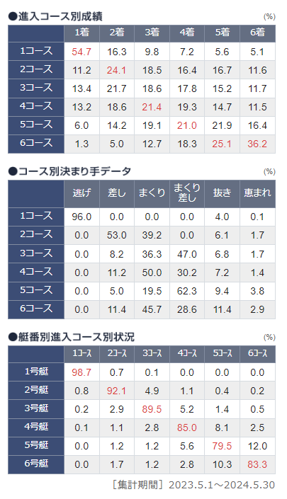 蒲郡競艇場の特徴と予想のコツ 目次 1. 蒲郡競艇場の基本情報 蒲郡競艇場の水面と環境 蒲郡競艇場のレース成績データ コース別1着率と2・3連率(2020年1月1日~2022年12月31日) 蒲郡競艇場の予想のコツ 1. 1コースの信頼度 2. 4コースの1着率 3. 2コースと5コースの連対率 三連単の配当分布 蒲郡競艇場のコース別決まり手 蒲郡競艇場の風の影響 蒲郡競艇場の企画レース 蒲郡競艇場の水面特性とレースの特徴 蒲郡競艇場の攻略法 蒲郡競艇場のその他の特徴 蒲郡競艇場のコース別攻略ポイント 1コース 2コース 3コース 4コース 5コース 6コース 蒲郡競艇場の攻略法まとめ 蒲郡競艇場のイベントと観光情報 イベント 観光スポット まとめ あわせて読みたい 蒲郡競艇場(がまごおりきょうていじょう)は、愛知県蒲郡市に位置し、全国の競艇場の中で比較的新しい施設です。ここでは、蒲郡競艇場の特徴とレース予想を的中させるためのコツを詳しく解説します。 1. 蒲郡競艇場の基本情報 所在地:愛知県蒲郡市竹谷町太田新田1-1 施行者:蒲郡市 通称:BOAT RACE蒲郡(ボートレースがまごおり) アクセス: JR東海道本線「蒲郡駅」から無料送迎バスで約10分 名鉄蒲郡線「蒲郡競艇場前駅」から徒歩約5分 蒲郡競艇場の水面と環境 水質:汽水で塩分濃度が低い 水面:プール水面で潮位差がなく、波も少ないため、比較的穏やか コース幅:1マークのバックストレッチは全国一広い156.7m 風の影響:内湾に位置するため風の影響が少ない 蒲郡競艇場のレース成績データ コース別1着率と2・3連率(2020年1月1日~2022年12月31日) コース1着率2連率3連率1コース54.8%71.9%81.3%2コース12.8%35.6%54.0%3コース12.7%34.4%53.7%4コース12.1%31.6%53.6%5コース6.1%19.9%38.9%6コース1.6%6.9%19.2% 蒲郡競艇場の予想のコツ 1. 1コースの信頼度 1コースの1着率は54.8%と全国平均とほぼ同じです。しかし、通年ナイター開催されているため、日没後のレースではモーターの出足が良くなることから、1コースの1着を狙いやすいです。 2. 4コースの1着率 4コースの1着率が12.1%と高く、特にまくりが決まりやすいのが特徴です。日没前のレースでは4コースの1着を狙うのが効果的です。 3. 2コースと5コースの連対率 2コースの2連対率は35.6%、5コースの2連対率は19.9%です。2コースは差しが多く、5コースはまくり差しが決まりやすいです。 三連単の配当分布 配当区分出現率鉄板(0円~1,999円)43.6%中穴(2,000円~9,999円)40.2%大穴(10,000円~)16.2% 蒲郡競艇場のコース別決まり手 コース逃げ差しまくりまくり差し抜き恵まれ1コース96.0%0.0%0.0%0.0%3.8%0.2%2コース0.0%56.3%32.7%0.0%9.3%1.7%3コース0.0%11.4%37.3%40.1%10.3%1.0%4コース0.0%12.5%52.6%27.6%5.3%2.0%5コース0.0%4.9%24.4%59.7%9.3%1.7%6コース0.0%12.7%25.4%50.0%9.1%2.7% 蒲郡競艇場の風の影響 追い風: 1コースと4コースの1着率が高くなる 向かい風: 2、3、5、6コースの1着率が高くなる 左横風: 1コースの1着率が高くなる 蒲郡競艇場の企画レース 進入固定競走:7Rで行われる進入固定競走では、全ての艇が枠番通りのコースからスタートするため、予想がしやすくなります。特に1コースの艇が逃げやすいです。 蒲郡競艇場の水面特性とレースの特徴 水面特性:1マーク側のバックストレッチが全国一の広さであり、握って回れる全国有数の高速水面です。風の影響も少なく穏やかな水面のため、スピード戦が繰り広げられます。 レースの特徴:年間を通じてナイター開催で、1コースが強い傾向がありますが、センターからのまくりも効きやすく、多彩なレース展開が見られます。2マークでの逆転劇も多く、迫力あるレースが特徴です。 蒲郡競艇場の攻略法 1コースの強さを活かす: ナイター開催では特に1コースが強いので、1コースの選手が実力者であれば1着を狙うのが基本です。 4コースのまくりを狙う: 4コースのまくり率が高いため、1~3コースの艇が出遅れた場合、4コースのまくりを狙うのが効果的です。 風向きを考慮する: レースの風向きによって、コースの有利不利が変わります。追い風の場合は1コースと4コース、向かい風の場合は2、3、5、6コースを狙うと良いでしょう。 モーター性能を重視する: モーターの2連率や展示タイムを確認し、良いモーターを使用している選手を中心に予想を立てるのがポイントです。 水面状況をチェックする: ナイターレースでは水面状況が変わりやすいので、直前の天気や風速を確認し、予想に反映させることが重要です。 蒲郡競艇場のその他の特徴 通年ナイター開催: 蒲郡競艇場は通年ナイター開催を行っており、夕方から夜にかけてレースが行われます。これにより、昼間に仕事をしているファンも気軽に観戦できます。 モーターの交換時期: モーターの交換時期は7月頃で、交換直後の7~9月はデータが少ないため、展示タイムや周回展示を重視しましょう。 オリジナル展示データ: 蒲郡競艇場では、一周タイム、まわり足タイム、直線タイムなどのオリジナル展示データが公開されています。これらのデータを活用して、モーター性能を詳細に把握することで、予想の精度を高めることができま