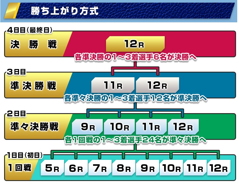 BBCトーナメントG1プレミアムG1競艇(ボートレース)初心者向け BBCトーナメント(ボートレースバトルチャンピオントーナメント)とは?出場資格、ルールなど 目次 BBCトーナメント(ボートレースバトルチャンピオントーナメント)とは?出場資格、ルールなど 大会の概要 出場資格 特徴的なルール 大会の売上と人気 歴代優勝者 まとめ ボートレースで勝ちたい人におすすめ ボートレースバトルチャンピオントーナメント(BBCトーナメント)は、2019年に新設されたボートレースのプレミアムG1競走の1つであり、トーナメント方式を採用した独特のルールを持つ大会です。このBBCトーナメントは、SG(スペシャルグレード)や他のプレミアムG1競走とは異なり、4日間という短期間で勝負が決まるのが特徴です。2012年の「賞金女王決定戦競走」以来の新設レースであり、注目度も非常に高い大会です。 2025年は、1月23日から1月26日に常滑ボートレース場で開催予定です。 大会の概要 BBCトーナメントは、毎年1月に開催されることが多く、ボートレース場で持ち回りで実施されます。最初の3回は年末に開催されていましたが、2023年以降はグランプリの後、年明けに行われるようになりました。SG競走や通常のG1競走が得点率によって勝者を決めるのに対して、BBCトーナメントは一発勝負のトーナメント形式で行われるため、緊張感が非常に高い競走です。 この大会は、48名の選手が出場し、1回戦から準々決勝、準決勝を勝ち上がり、最終的に決勝戦で優勝者が決まります。トーナメント形式のため、1度の敗北が即座に脱落を意味し、選手たちには極めて高い集中力と安定した成績が求められます。特に注目すべき点は、準決勝までは通常のレース同様にコース取りが着順に基づいて行われるものの、決勝戦では「あみだくじ」で枠番が決定されるという特殊な方式を採用している点です。これにより、成績上位者でも不利な外枠を引く可能性があり、波乱の展開が期待される要因となっています。 出場資格 BBCトーナメントに出場するためには、前年の優勝者やSG競走、プレミアムG1競走、さらにG2レディースオールスターや全国ボートレース甲子園の優勝者など、厳しい条件をクリアする必要があります。また、SGやプレミアムG1競走での過去10ヶ月の勝率上位者も出場資格を持つため、実力者のみが集まる高レベルな大会です。このように、実績を積み上げた選手しか出場できないため、選手たちの間でも特別な大会として位置づけられています。 さらに、この大会の特徴的な点は、級別によらず条件を満たせば出場できるという点です。他のSGやG1競走ではA1級の選手のみが出場するのに対し、BBCトーナメントではA2級以下の選手でもG2競走やファン感謝3Daysなどで優勝すれば出場権を得られる可能性があります。ただし、上位選手を相手に下剋上を果たすのは至難の業です。特にA1級トップの実力者と競う際には、実力差が顕著に現れることが多いため、下位の選手にとっては非常に厳しい戦いが続きます。 特徴的なルール BBCトーナメントの最大の特徴は、トーナメント形式を採用していることです。通常のボートレースでは、6着になっても次のレースで挽回するチャンスがありますが、BBCトーナメントでは一度の敗北が即脱落を意味します。全てのレースで1~3着に入ることが絶対条件であり、4着以下になった選手は次のラウンドに進めません。このため、内枠の選手は無理をせず3着以内を狙い、外枠の選手は積極的に攻めに出るという戦略が重要になります。 また、決勝戦では前述のように「あみだくじ」によって枠番が決まるため、運の要素が大きく影響します。このルールにより、成績上位者が必ずしも有利な枠を得られるわけではなく、波乱の展開が生まれることもしばしばです。特に外枠に入った選手がダッシュで攻めて波乱を起こす可能性があるため、決勝戦では予想が難しい展開になることが多いです。 大会の売上と人気 BBCトーナメントは新設されて以来、毎年高い売上を記録しています。特に、2023年に大村競艇場で開催された際には、総売上が105億7500万円を超えるという驚異的な数字を達成しました。 これは、4日間という短期間の開催にも関わらず、1日当たりの売上が非常に高いことを示しています。SGや他のG1競走と比べると、BBCトーナメントは短期間で集中して開催されるため、ファンからの注目度が高い大会となっています。 歴代優勝者 これまでの大会では、各年で実力者が優勝を果たしており、その中でも注目されるのは2024年に大村競艇場で優勝した関浩哉選手です。 関浩哉 29歳という若さで3度目のG1制覇を達成し、その成長ぶりが話題になりました。 また、2023年には「艇界のレジェンド」と呼ばれる松井繁選手が優勝し、コンマ11のトップスタートからイン逃げを成功させるという見事なレースを展開しました。 松井 繁 他にも、2021年の丸野一樹選手や2020年の寺田祥選手、そして初代優勝者である田村隆信選手がそれぞれ大